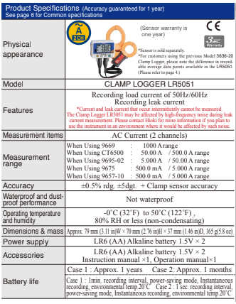 - Độ chính xác: ±2.0% rdg. ±0.13% f.s. (máy chính + độ chính xác của cảm biến, ở 500.0 A range, 50/60 Hz)