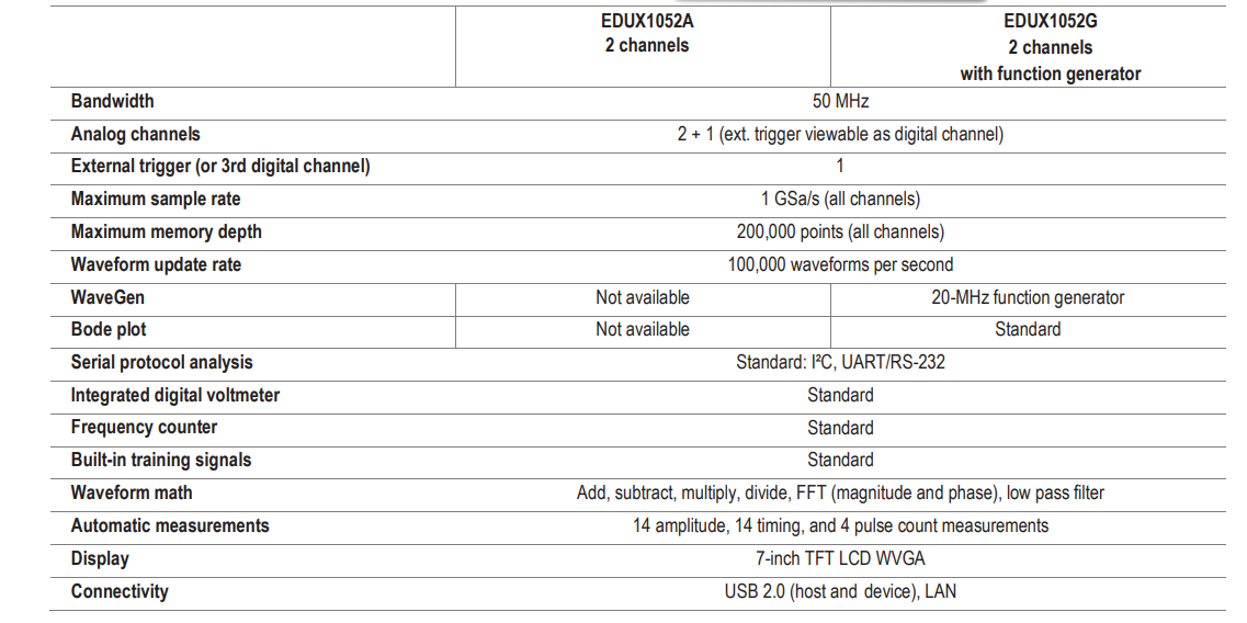 Đặc điểm nổi bật : Máy hiện sóng EDUX1052A cung cấp băng thông 50 MHz trên 2 kênh analog