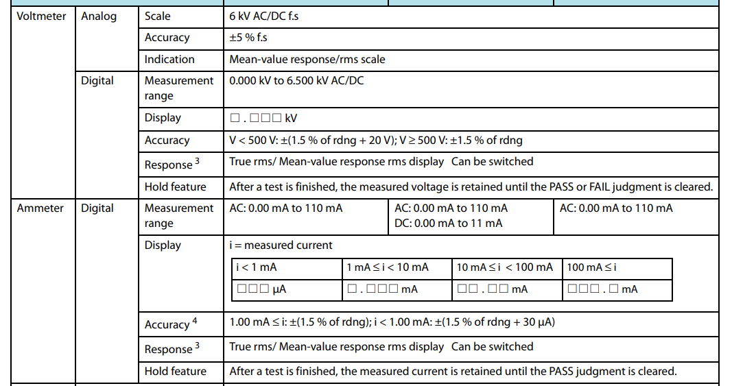 • Với đầu ra 5 kV / 100 mA (AC) và 6 kV / 10 mA (DC), thiết bị này có thể được sử dụng trong Hipot (điện áp chịu đựng) & thử nghiệm điện trở cách điện của thiết bị điện tử và bộ phận điện tử, dựa trên các yêu cầu của IEC , EN, UL, VDE, JIS, và các tiêu chuẩn an toàn quốc tế khác và Luật An toàn Vật liệu và Thiết bị Điện.