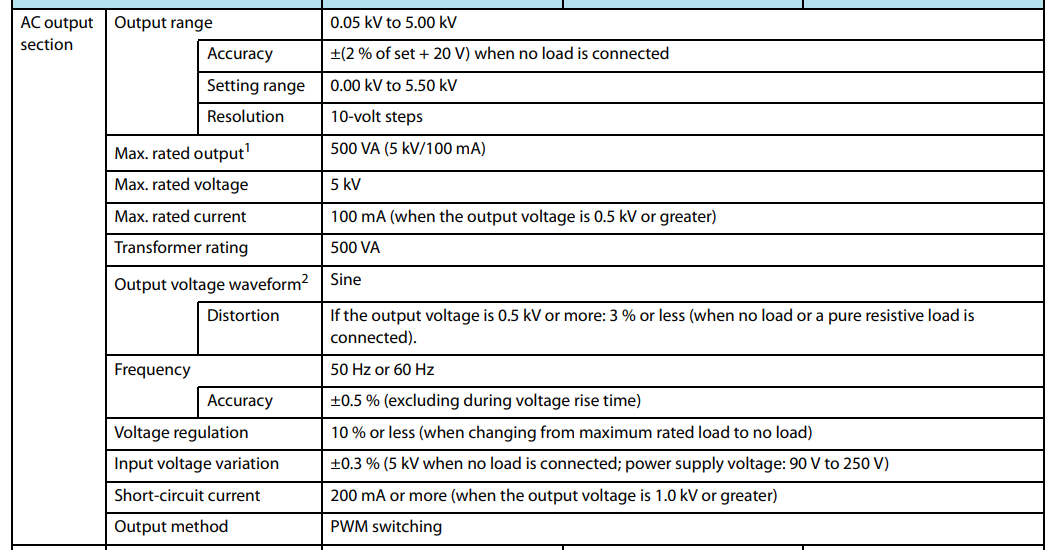 • Với đầu ra 5 kV / 100 mA (AC) và 6 kV / 10 mA (DC), thiết bị này có thể được sử dụng trong Hipot (điện áp chịu đựng) & thử nghiệm điện trở cách điện của thiết bị điện tử và bộ phận điện tử, dựa trên các yêu cầu của IEC , EN, UL, VDE, JIS, và các tiêu chuẩn an toàn quốc tế khác và Luật An toàn Vật liệu và Thiết bị Điện.