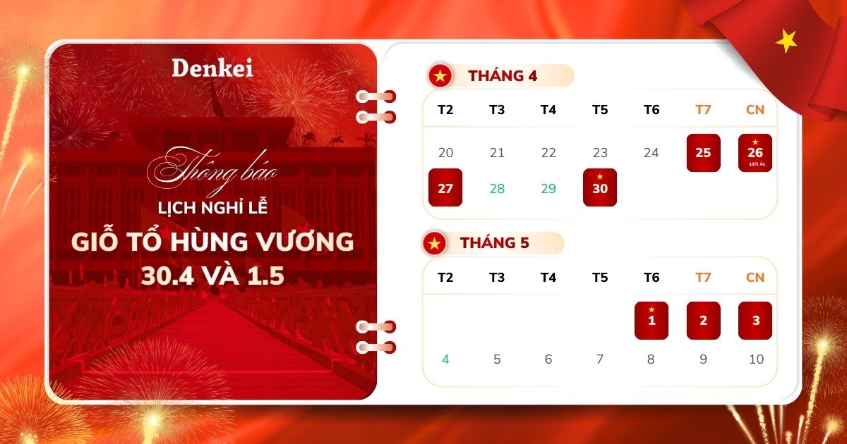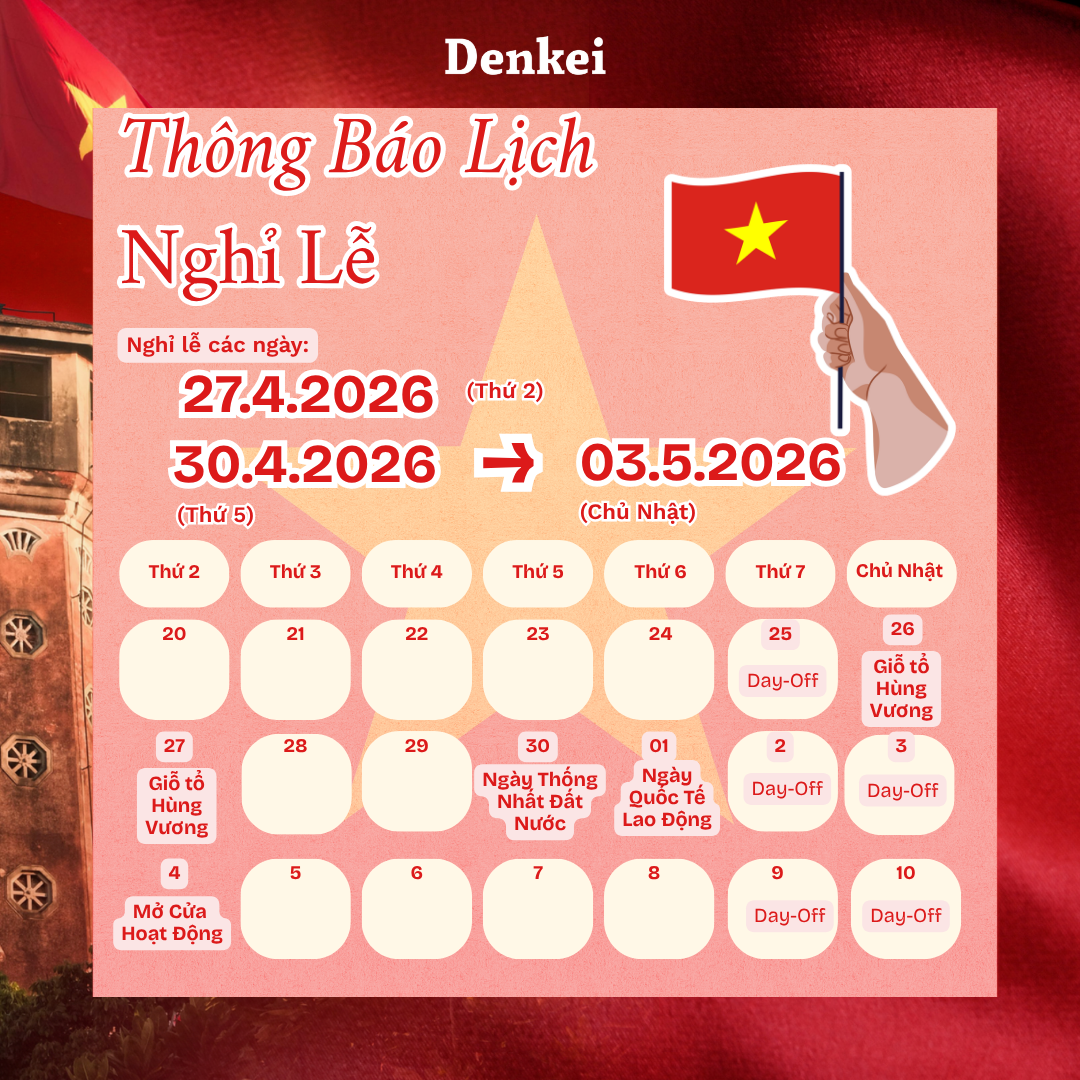 Nihon Denkei Việt Nam trân trọng thông báo đến Quý Khách về lịch nghỉ nghỉ lễ Ngày Giỗ Tổ Hùng Vương, Ngày Chiến thắng 30/4 và Ngày Quốc tế Lao động 01/5 năm 2026: