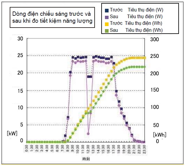– Thiết bị ghi lại điện năng tiêu thụ trong các khung giờ khác nhau, trong ngày.Phân tích dữ liệu trước và sau các biện pháp cải thiện